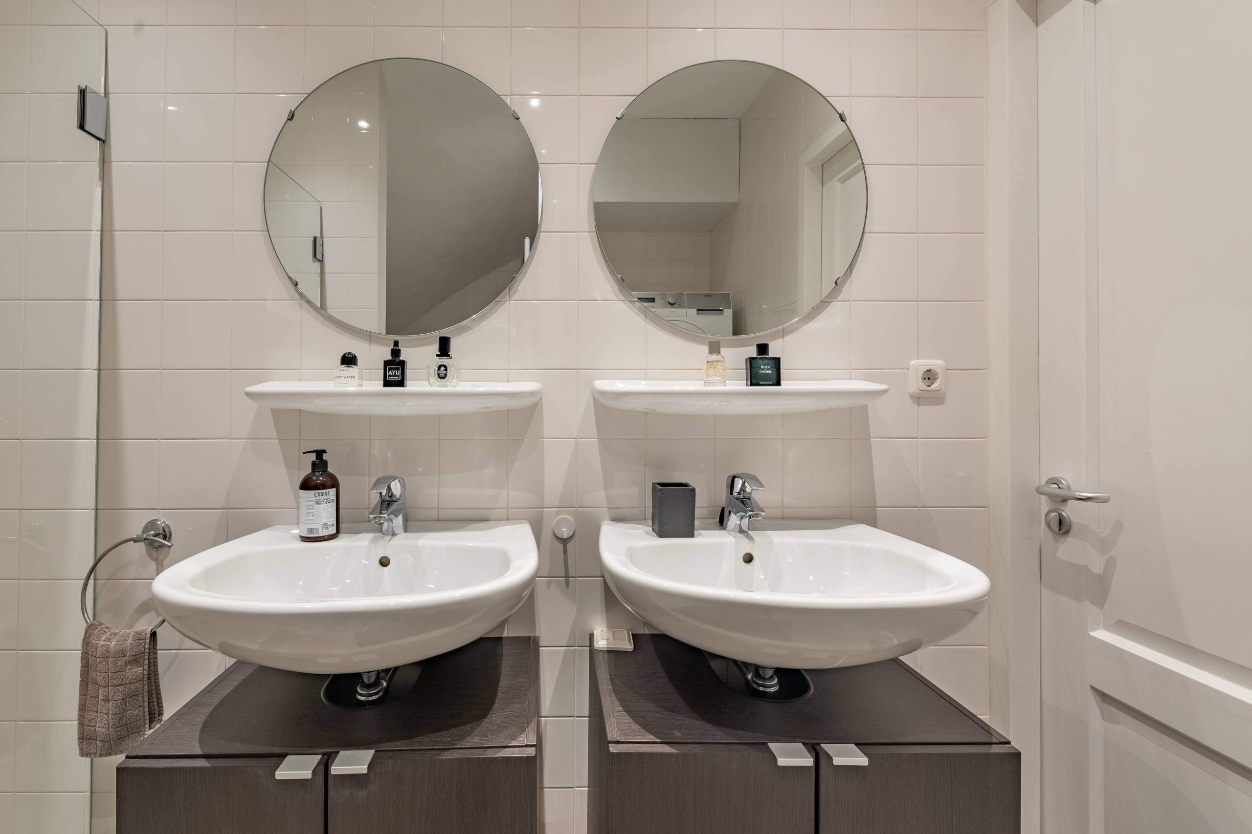 De badkamer en de slaapkamer zijn bereikbaar via een ruime overloop met kasten. De badkamer is v.v. een dubbele wastafel, inloop douche met glazen wand, ligbad en een wasmachine en droger aansluiting. De badkamer heeft een mooie terrazzo vloer en de wandtegels lopen door tot aan het plafond.