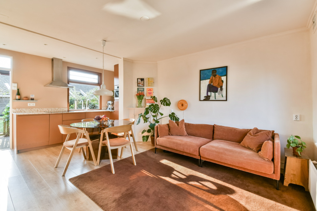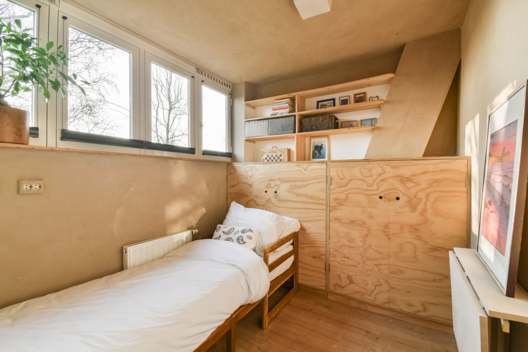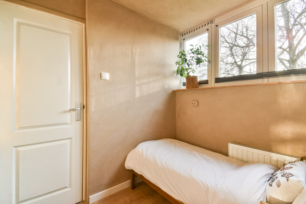 Binnen en buiten lopen hier mooi in elkaar over. Al in de vroege ochtend straalt de zon de achtertuin in; dat is heerlijk wakker worden met een kop koffie. Dankzij de twee tuinen geniet je de hele dag van zon, perfect voor een gezellige borrel met vrienden of een rustig moment voor jezelf. De tuin grenst aan een gezamenlijke binnentuin, wat bijdraagt aan het open en groene karakter van Disteldorp. Op warme zomerdagen loop je bovendien 20 meter de straat uit naar de zwemtrap, die met de buurt is gefinancierd, voor een verfrissende duik.