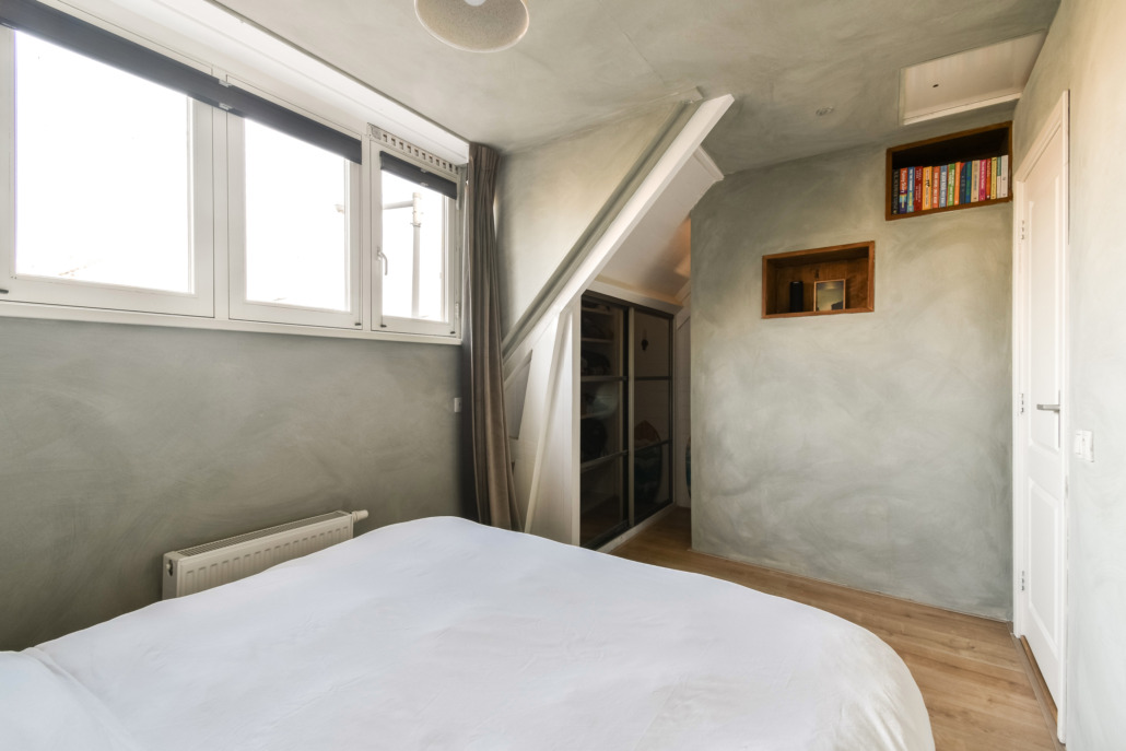 Op de bovenste verdieping liggen twee comfortabele slaapkamers, beide voorzien van praktische en smaakvolle inbouwkasten en brede dakkapellen over de volle breedte. Medio 2025 zijn de vloertegels van de badkamer en hal vernieuwd met een stijlvol zwart-wit patroon, passend bij de historie van het huis.
