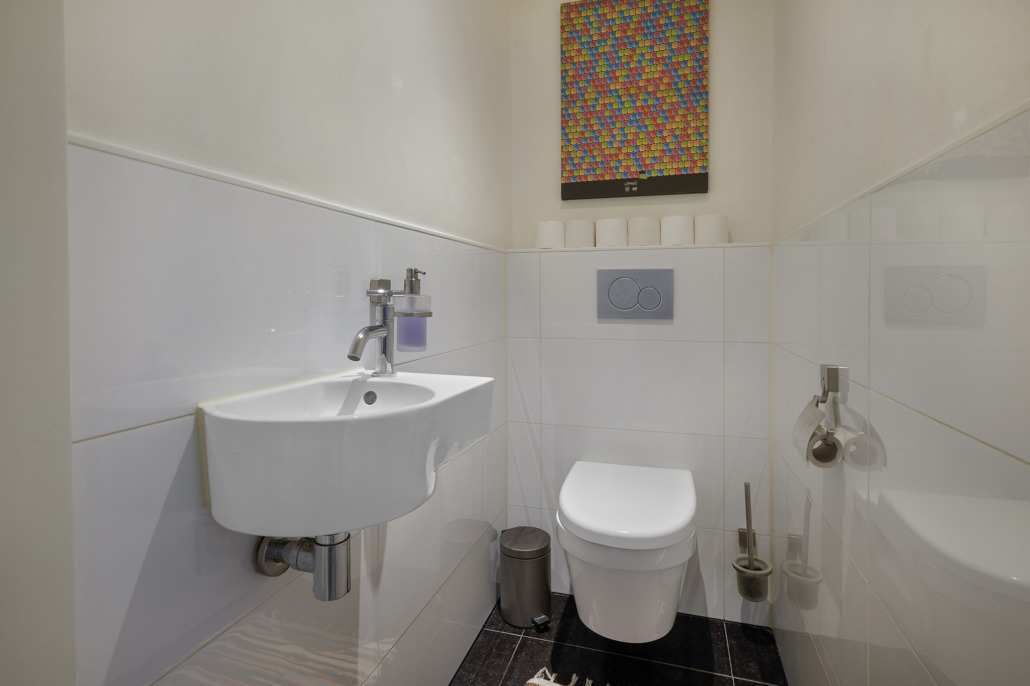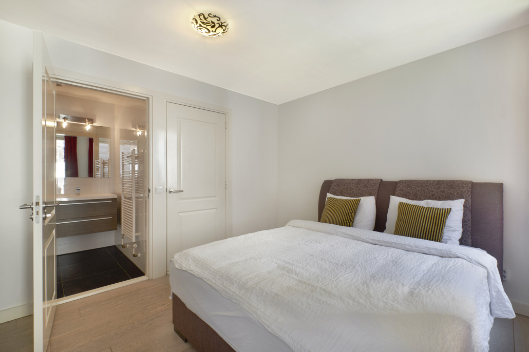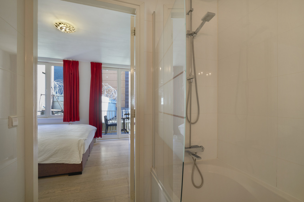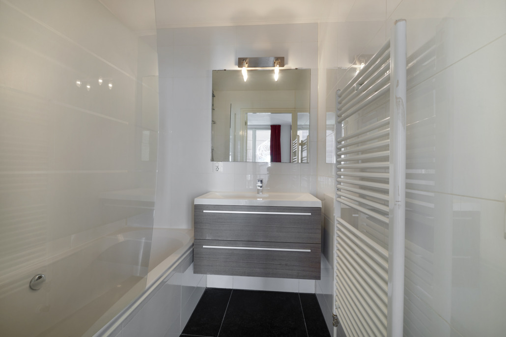 Aan de achterzijde van het appartement bevindt zicht de ruime slaapkamer van ca. 12 m² met toegang tot het brede balkon met veel privacy. De badkamer is eveneens toegankelijk vanuit de badkamer, de badkamer is v.v. een ligbad, modern wastafelmeubel en een handdoekradiator. Vanuit de gang is er toegang tot een separaat toilet met fonteintje en een stookruimte met CV-opstelling en de aansluitingen voor de wasmachine.