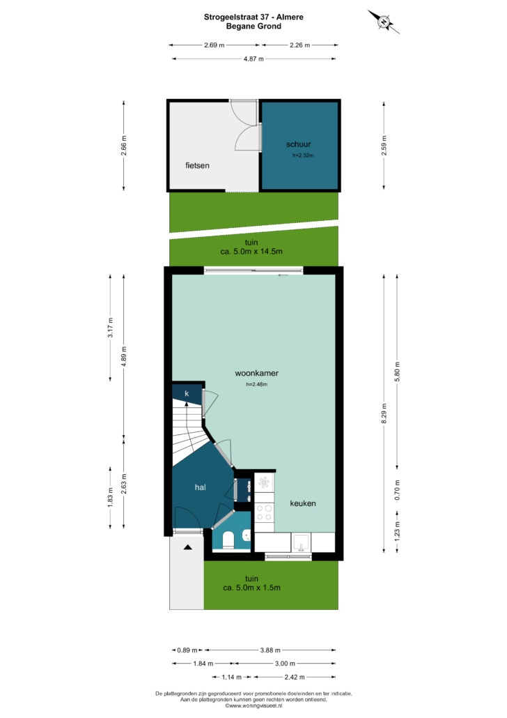 Het woonoppervlak is opgemeten conform meetinstructies gebruikmakende van de NEN2580. De Meetinstructie is bedoeld om een meer eenduidige manier van meten toe te passen voor het geven van een indicatie van de gebruiksoppervlakte. De Meetinstructie sluit verschillen in meetuitkomsten niet volledig uit, door bijvoorbeeld interpretatieverschillen, afrondingen of beperkingen bij het uitvoeren van de meting. Alle opgegeven maten en oppervlaktes zijn derhalve indicatief. Verkopende partij geeft hierover geen garanties.